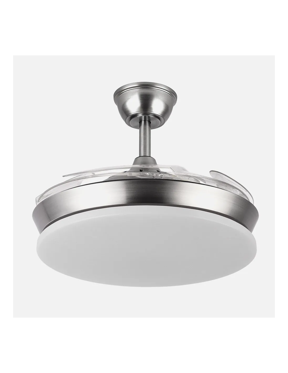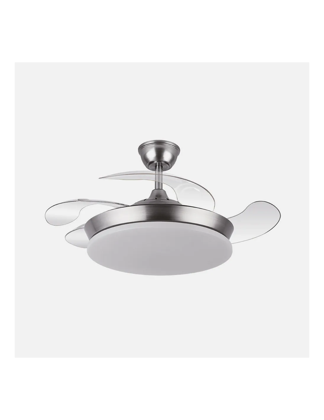 Su acabado en color níquel le confiere un aspecto sofisticado y actual, perfecto para ambientes modernos, minimalistas o incluso industriales. Gracias a sus aspas retráctiles, mantiene una apariencia limpia y discreta cuando no está en funcionamiento.