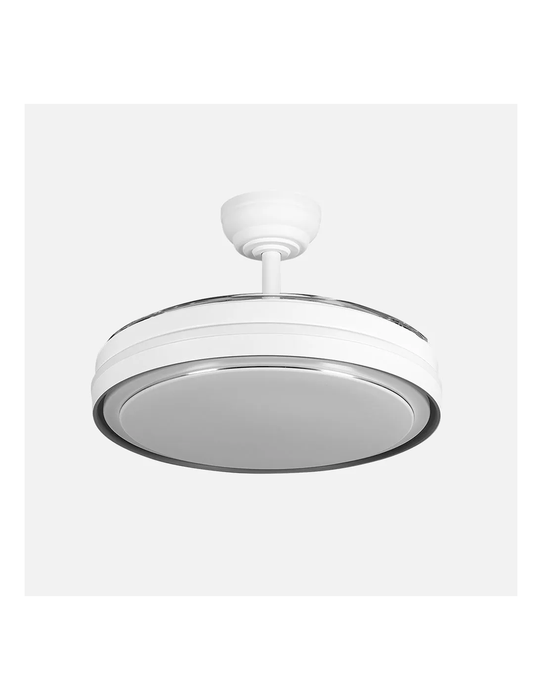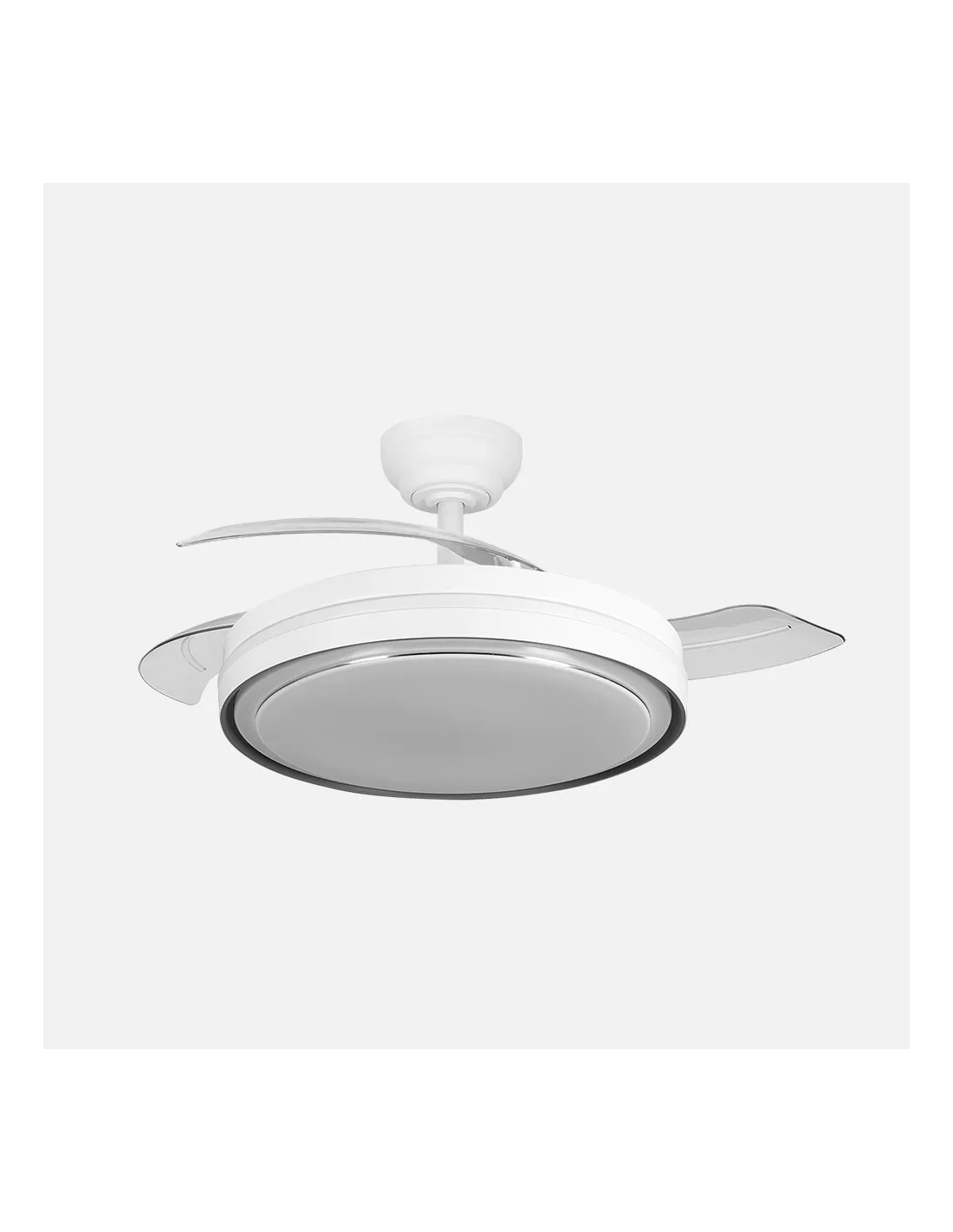 Su acabado en color blanco aporta luminosidad y amplitud visual, convirtiéndolo en una pieza versátil que se adapta fácilmente a cualquier estancia. Gracias a sus aspas retráctiles, mantiene una estética discreta cuando no está en funcionamiento.