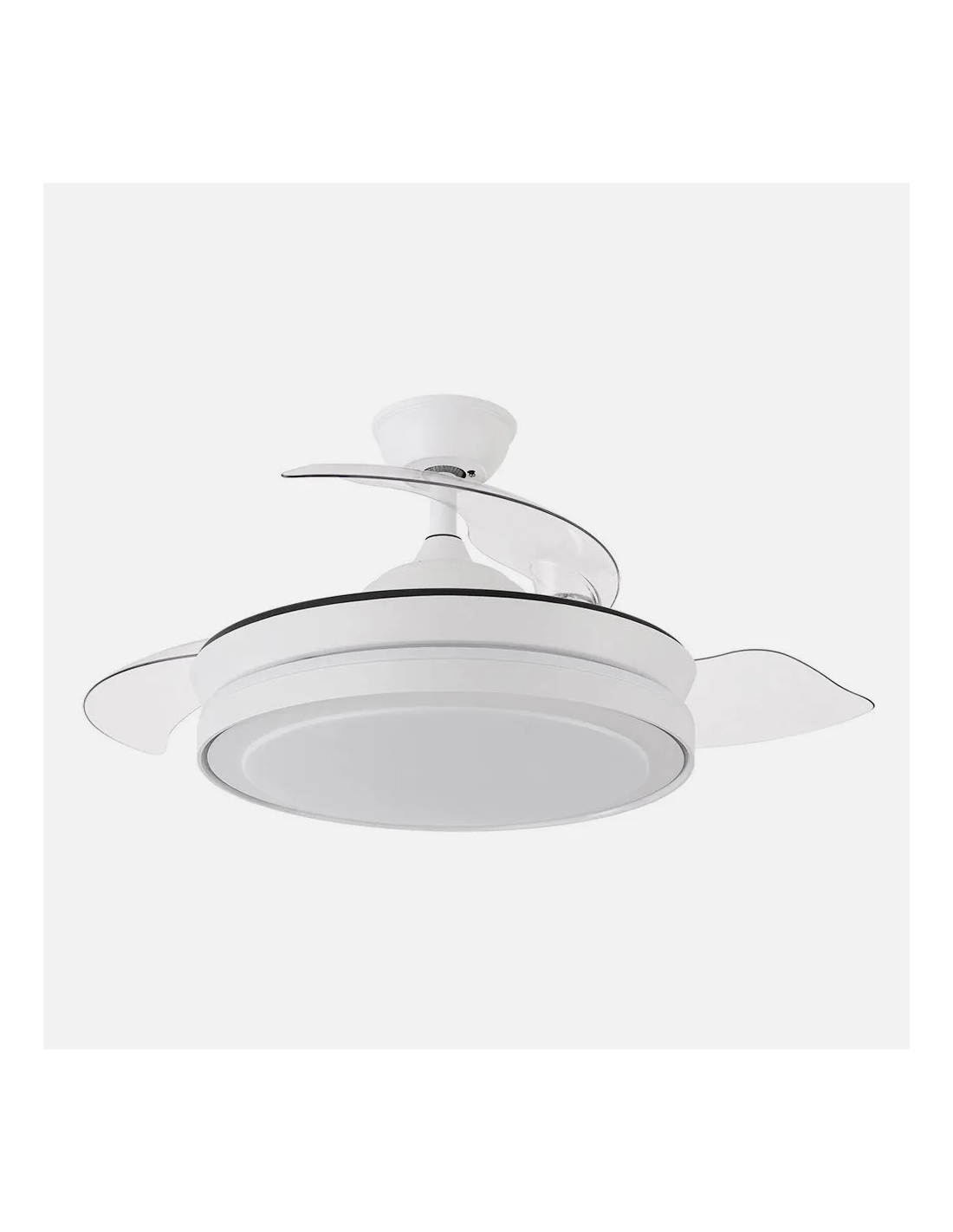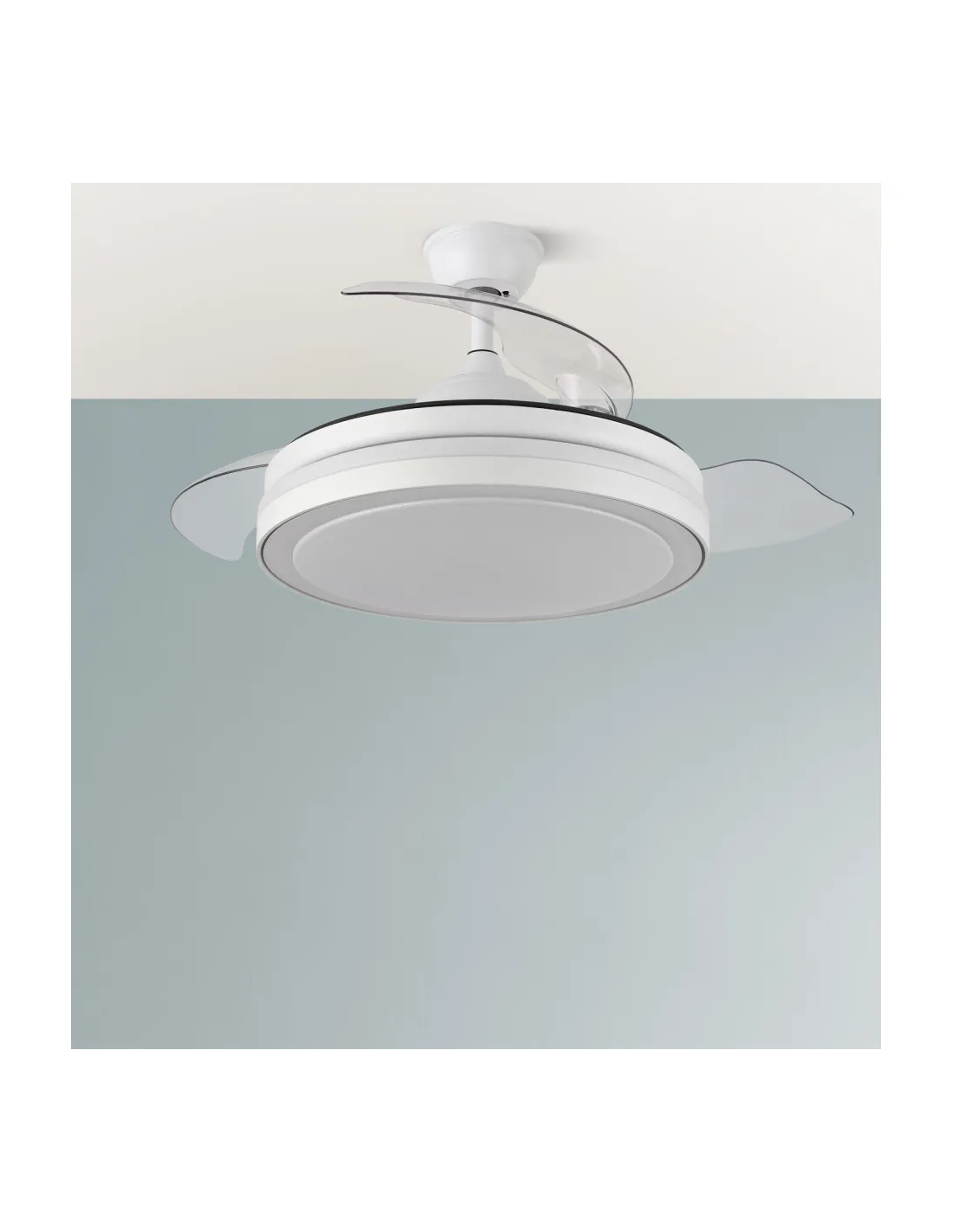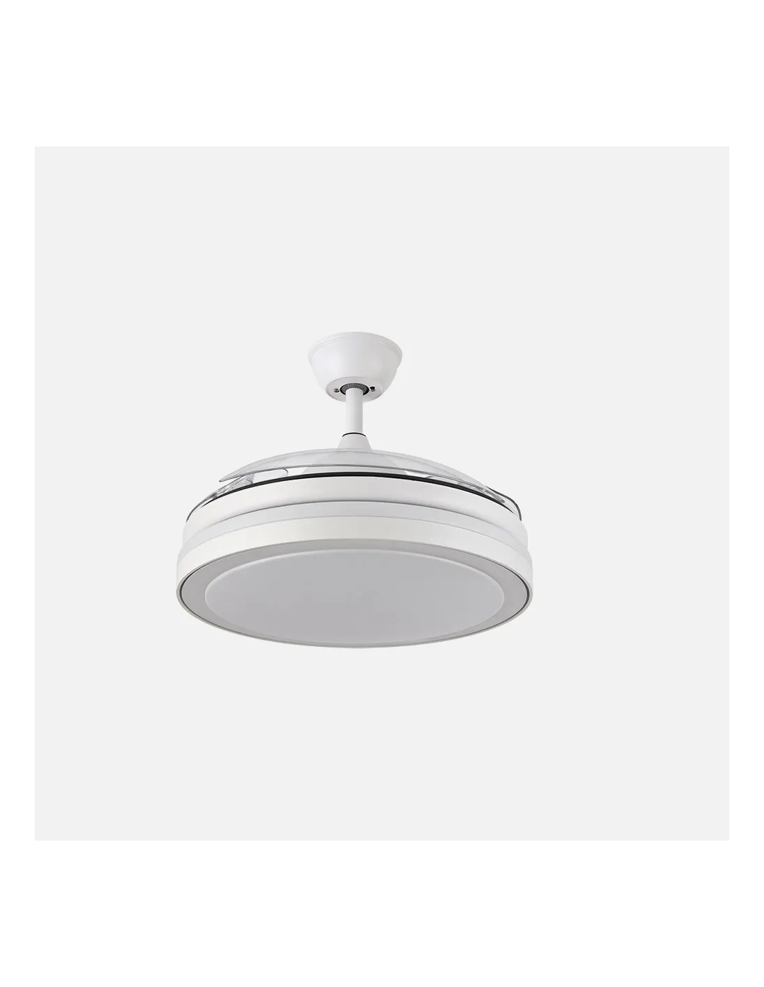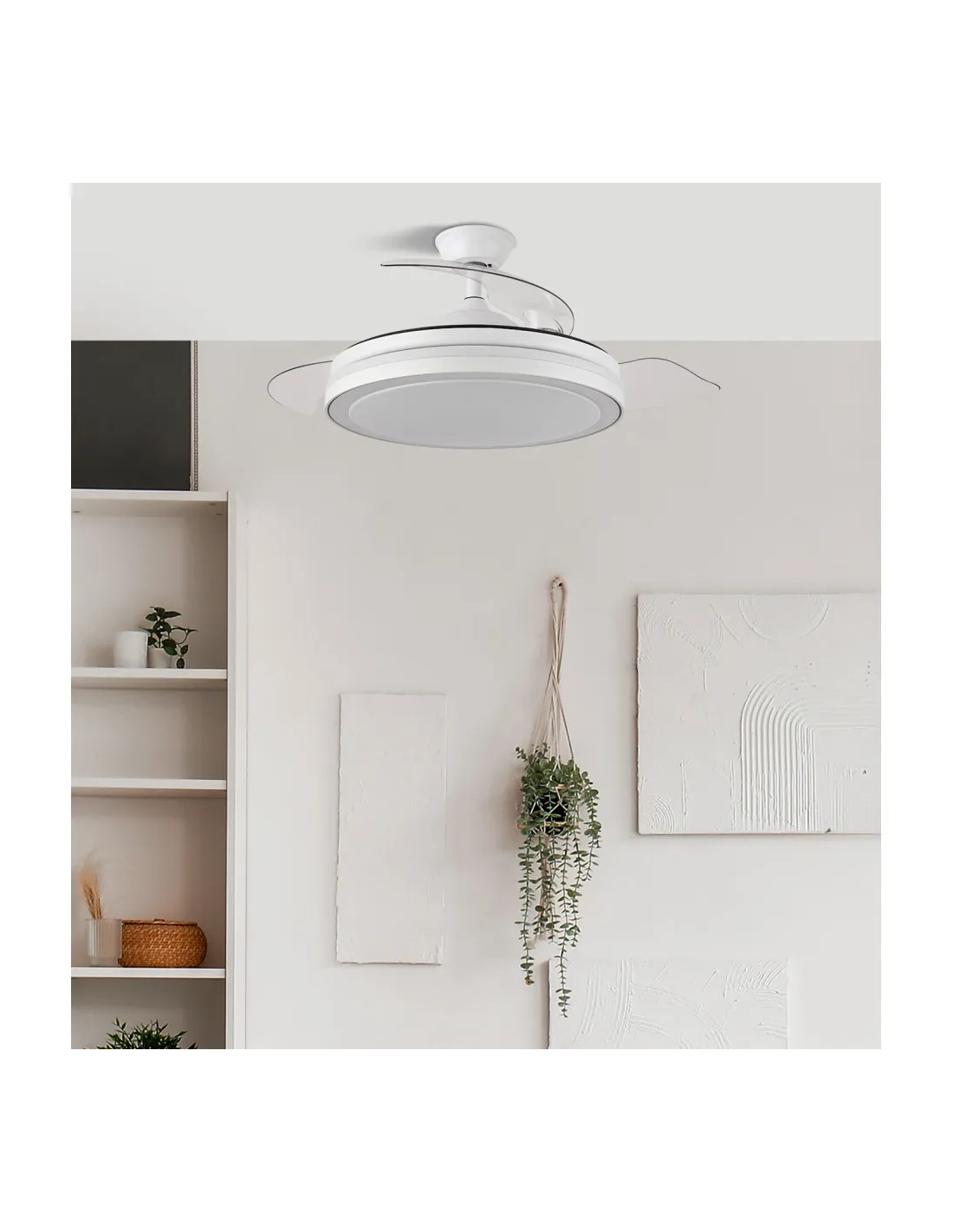 Su acabado en color blanco aporta luminosidad y sensación de amplitud, convirtiéndolo en una pieza versátil que encaja en cualquier tipo de decoración. Gracias a sus aspas retráctiles, mantiene una apariencia limpia y discreta cuando no está en funcionamiento.