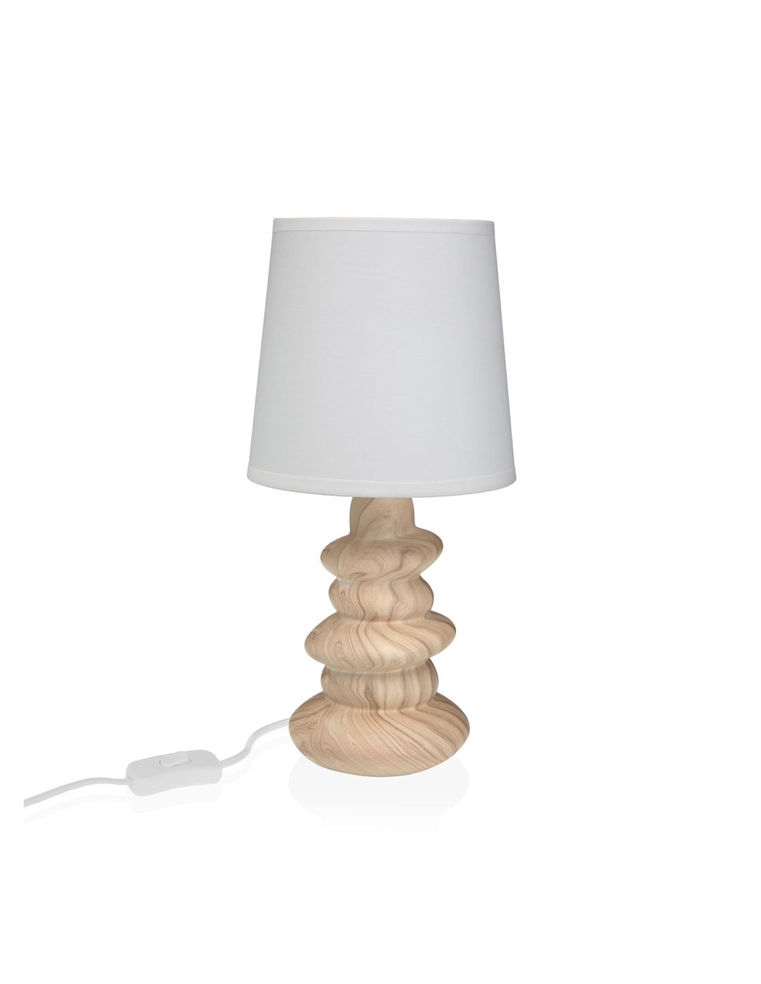 Su diseño sencillo y elegante se completa con una pantalla de tela en color blanco, que suaviza la luz y crea una iluminación agradable y envolvente. Gracias a esta combinación de materiales y tonos neutros, esta lámpara de sobremesa se adapta fácilmente a diferentes estilos decorativos, desde ambientes nórdicos y naturales hasta espacios modernos o contemporáneos.
