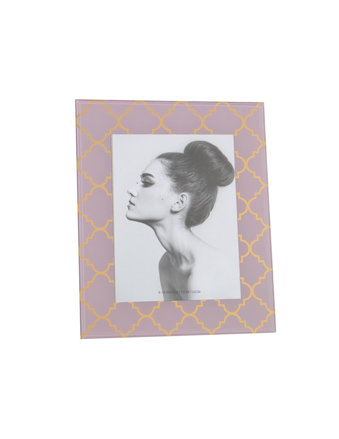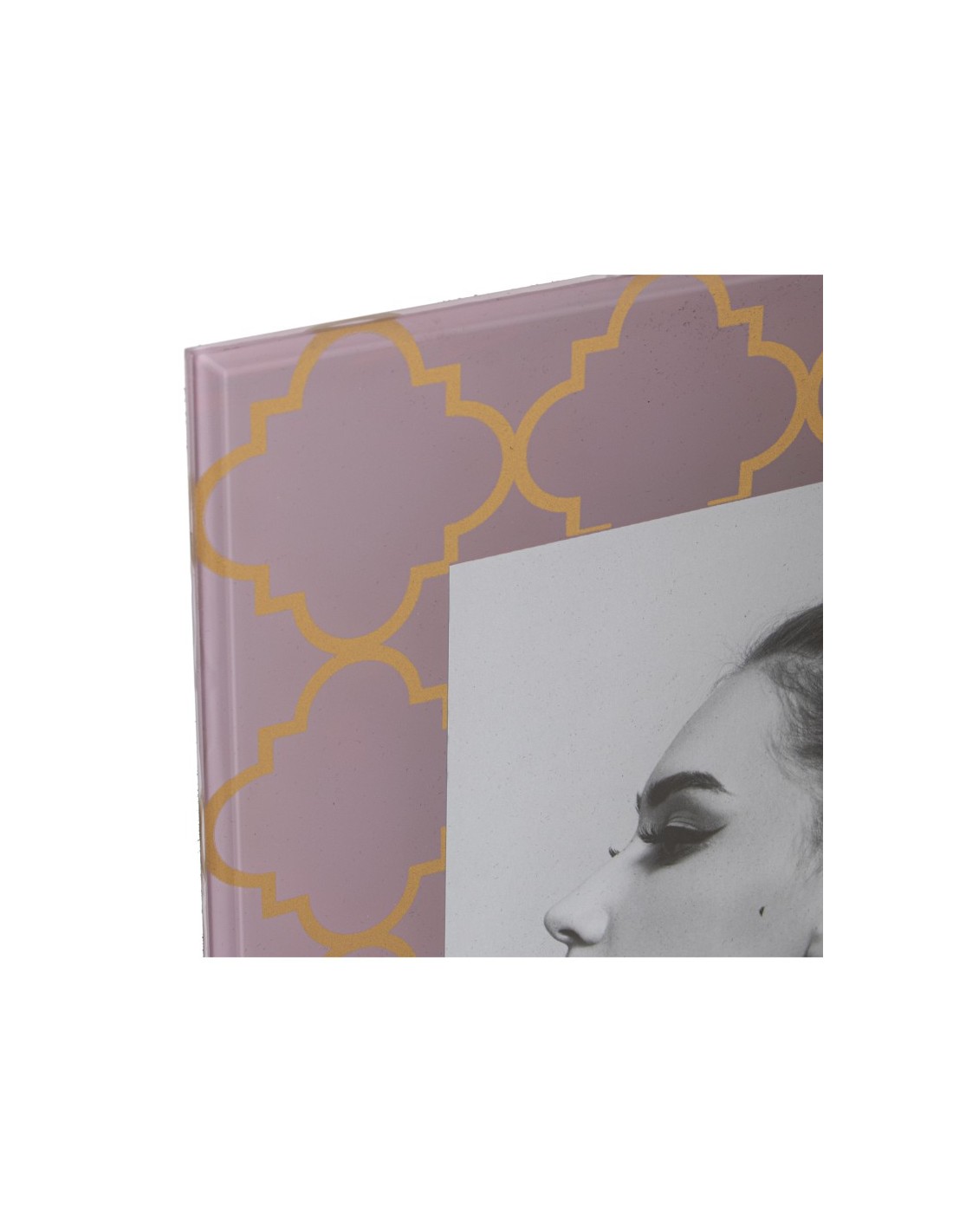 El cristal permite una visualización clara y luminosa de la imagen, mientras que los tonos rosa y dorado añaden un estilo delicado que encaja en ambientes modernos, clásicos o románticos.
