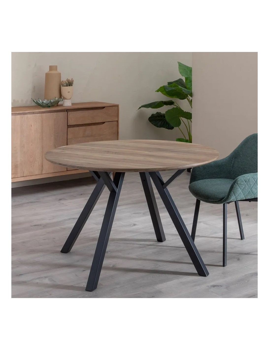 Una de sus principales ventajas es su diseño redondo de 120 cm, que favorece la interacción y la comodidad al permitir que todos los comensales tengan un espacio equilibrado. Además, al no tener esquinas, es ideal para hogares con niños o espacios donde se busca fluidez en la circulación.