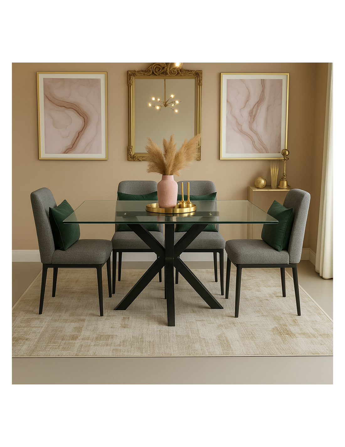 Su principal ventaja es la combinación entre el cristal templado y las patas metálicas en diseño araña, creando una mesa muy resistente, moderna y estética. La estructura metálica en negro aporta carácter y robustez, mientras que el cristal transparente genera una sensación de amplitud visual.