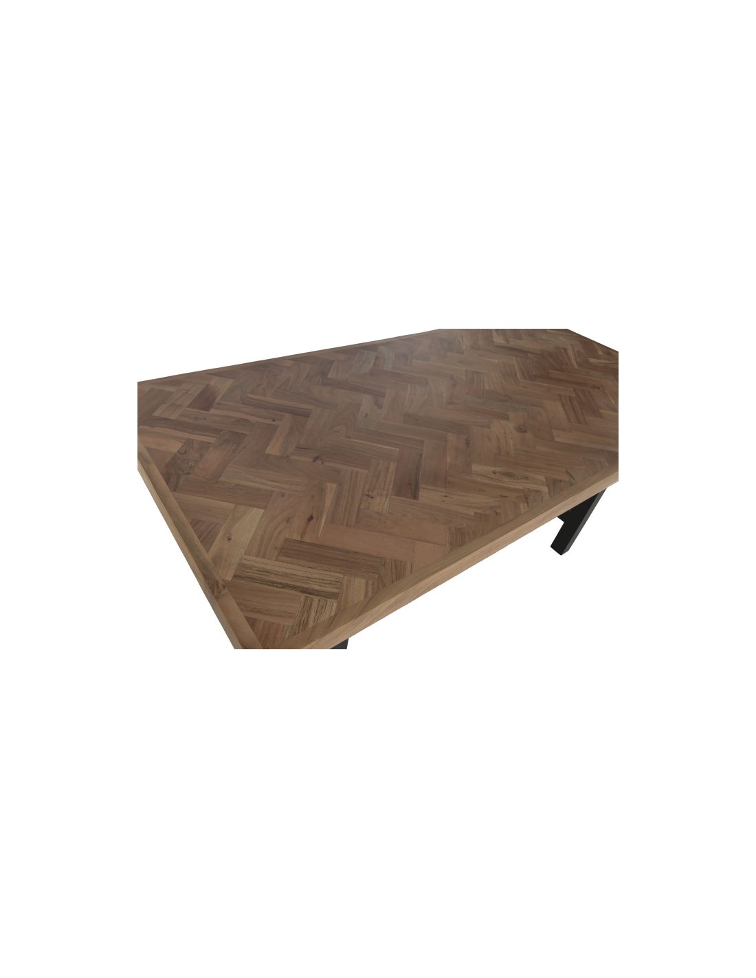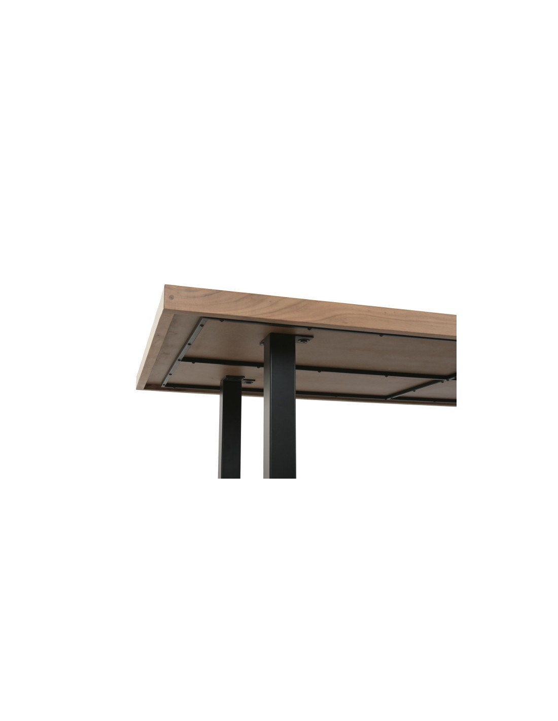 El tablero de madera de acacia natural destaca por sus vetas y tonalidades únicas, aportando calidez y un aspecto auténtico al comedor. Gracias a su refuerzo con listones de metal, la mesa ofrece una mayor estabilidad y una estructura sólida, pensada para un uso continuado sin perder firmeza.