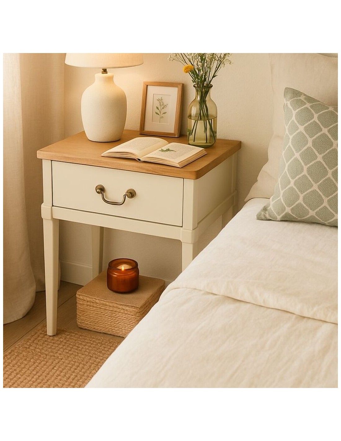 La Mesita de Noche 1 Cajón Amelie encaja a la perfección en estilos decorativos como el nórdico, romántico, clásico renovado, shabby chic o contemporáneo suave, gracias a su diseño sencillo y elegante.