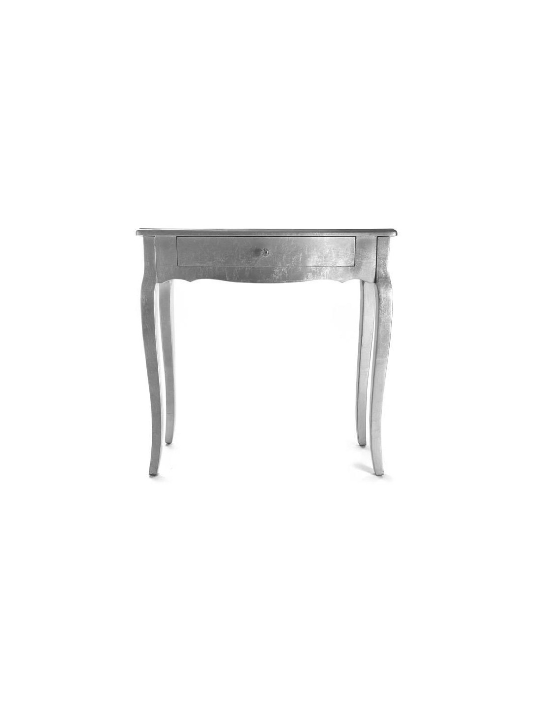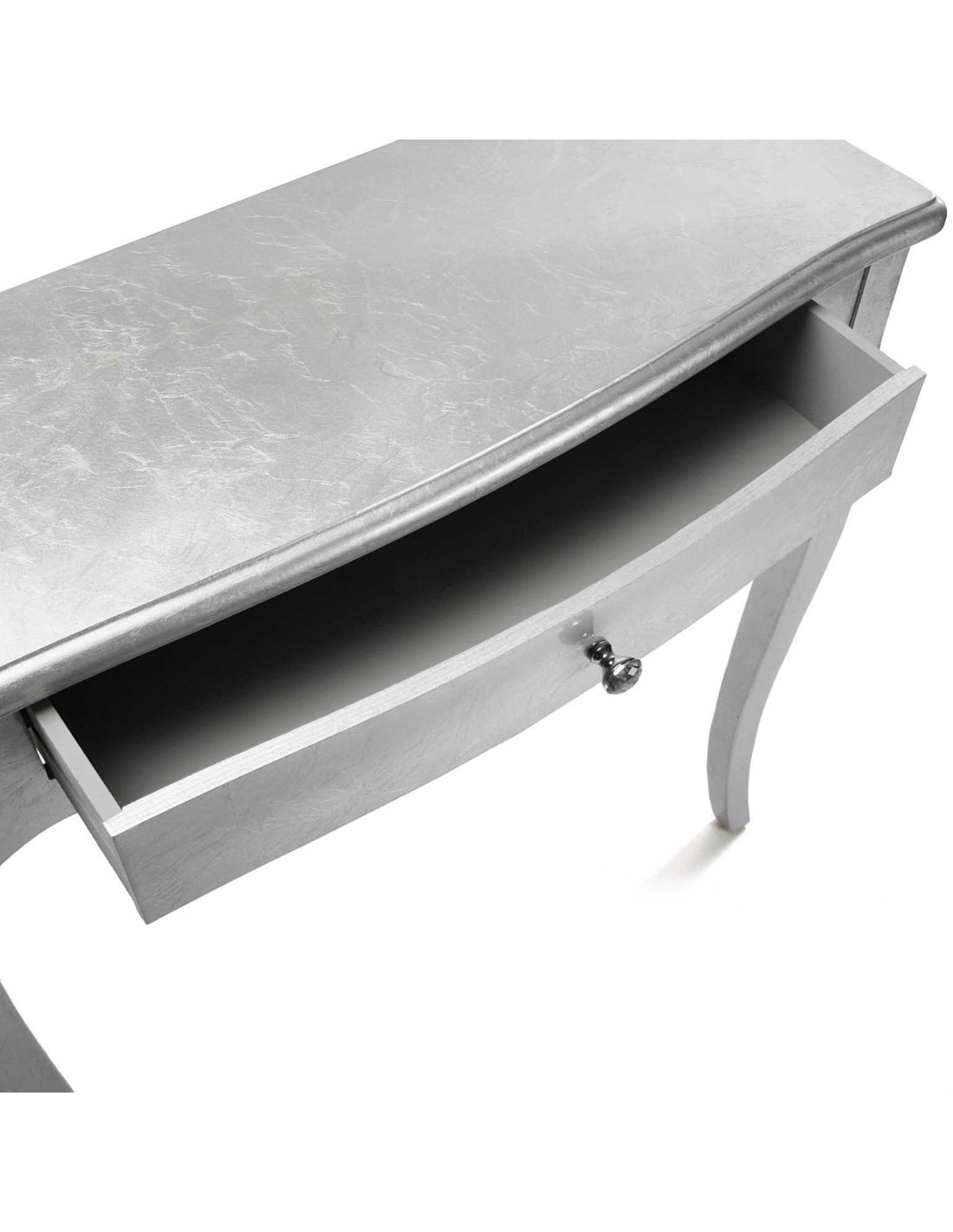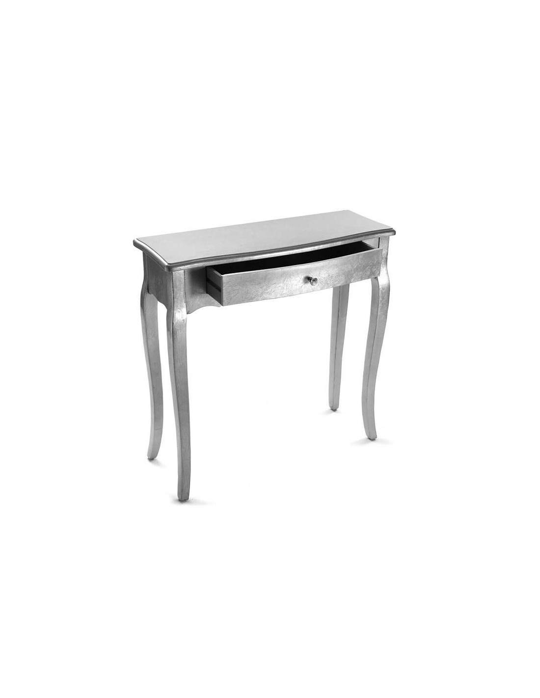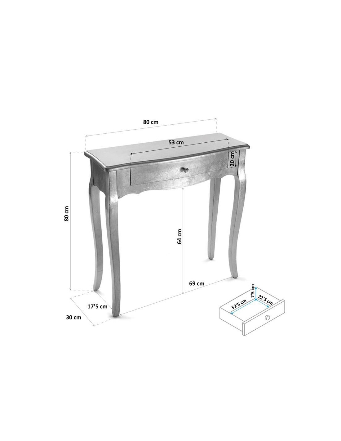 Elegante mueble de entrada fabricado en madera y pintado en un sofisticado color plata, perfecto para aportar estilo y funcionalidad a tu hogar. Este diseño cuenta con 1 cajón práctico para guardar pequeños objetos como llaves, documentos o accesorios, manteniendo el orden en la entrada de tu casa.