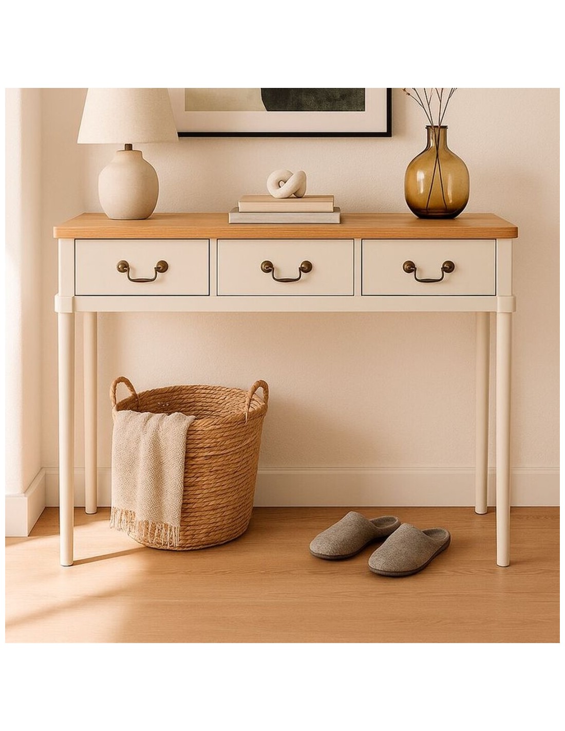 Sus tres cajones ofrecen un espacio perfecto para guardar llaves, correspondencia, documentos, accesorios o pequeños objetos del día a día, ayudando a mantener el recibidor ordenado y funcional.