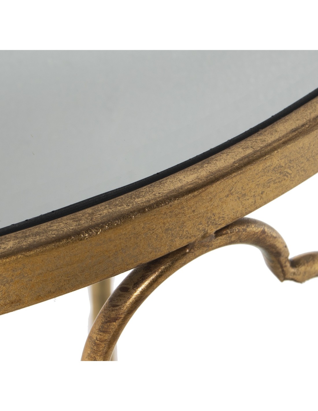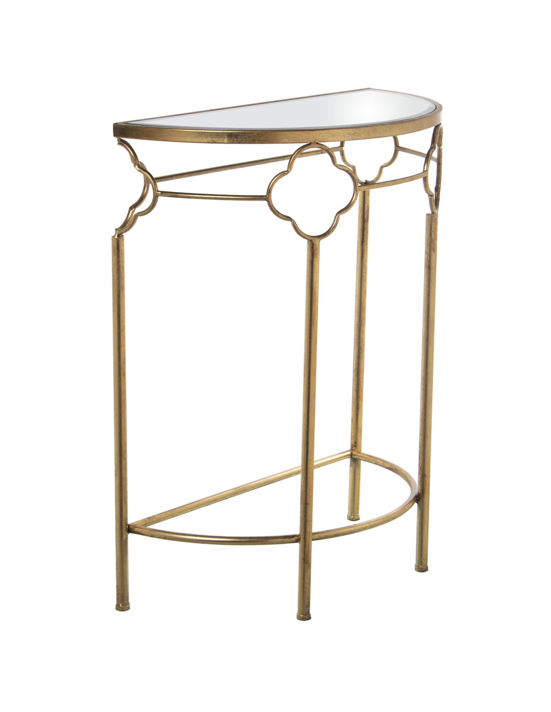 El acabado en color dorado aporta un toque sofisticado y decorativo, mientras que la base de espejo ayuda a reflejar la luz, creando una mayor sensación de amplitud y claridad en la estancia. Es ideal para colocar elementos decorativos como jarrones, bandejas, figuras, velas o pequeños accesorios que aporten personalidad a la entrada del hogar.