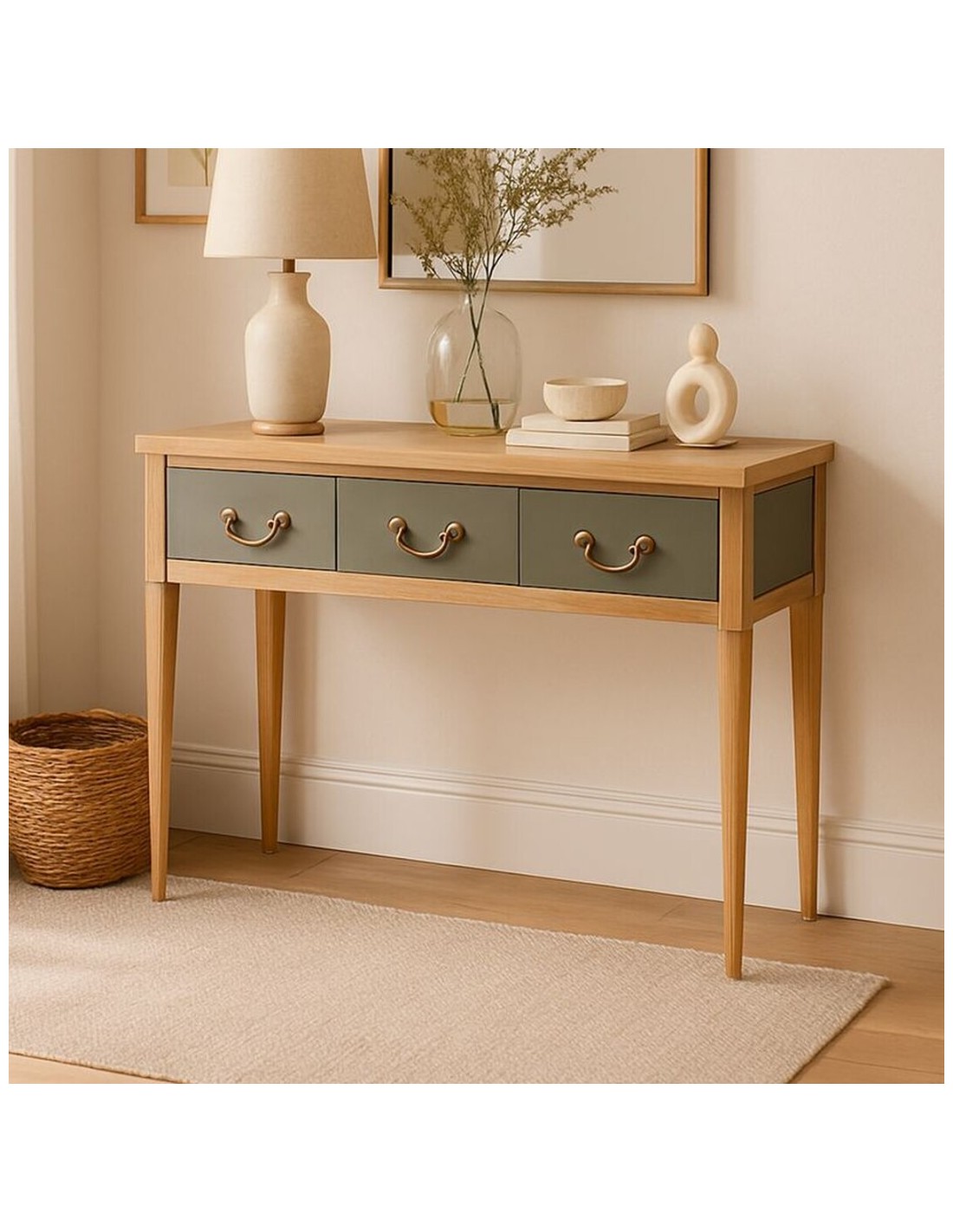 El Mueble de Entrada 3 Cajones Cambridge es una pieza decorativa y funcional diseñada para aportar orden, elegancia y personalidad al recibidor de tu hogar. Fabricado en madera en color natural, este mueble destaca por la combinación armónica de sus tres cajones en color gris, que aportan contraste y modernidad. Los tiradores en metal de color oro envejecido añaden un toque sofisticado y elegante, mientras que su diseño de líneas rectas y sus cuatro patas redondas en cada esquina refuerzan su estética equilibrada y atemporal. Con unas medidas de 110 cm de ancho, 30 cm de fondo y 80 cm de alto, es ideal para entradas y pasillos sin renunciar al espacio de almacenamiento.