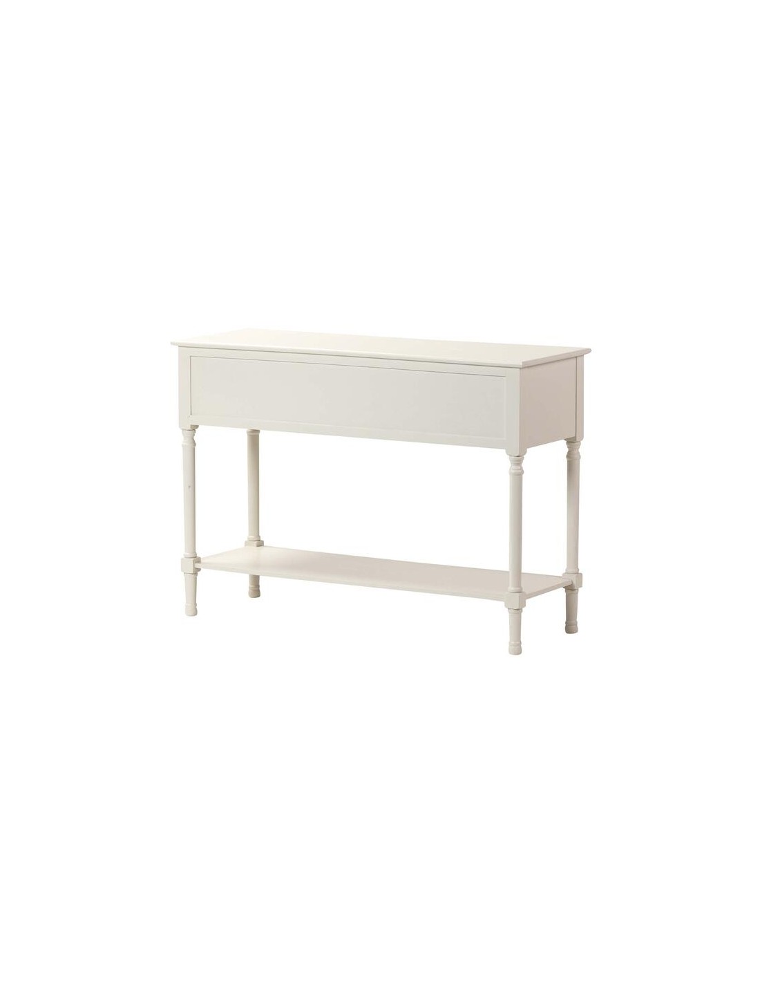 Sus tiradores de metal en color negro refuerzan su carácter decorativo y aportan un toque actual, mientras que la balda inferior ofrece un espacio extra para colocar cestas, zapatos o elementos decorativos. Todo ello se apoya sobre cuatro patas de diseño clásico que elevan el mueble del suelo, aportando ligereza visual y facilitando la limpieza.