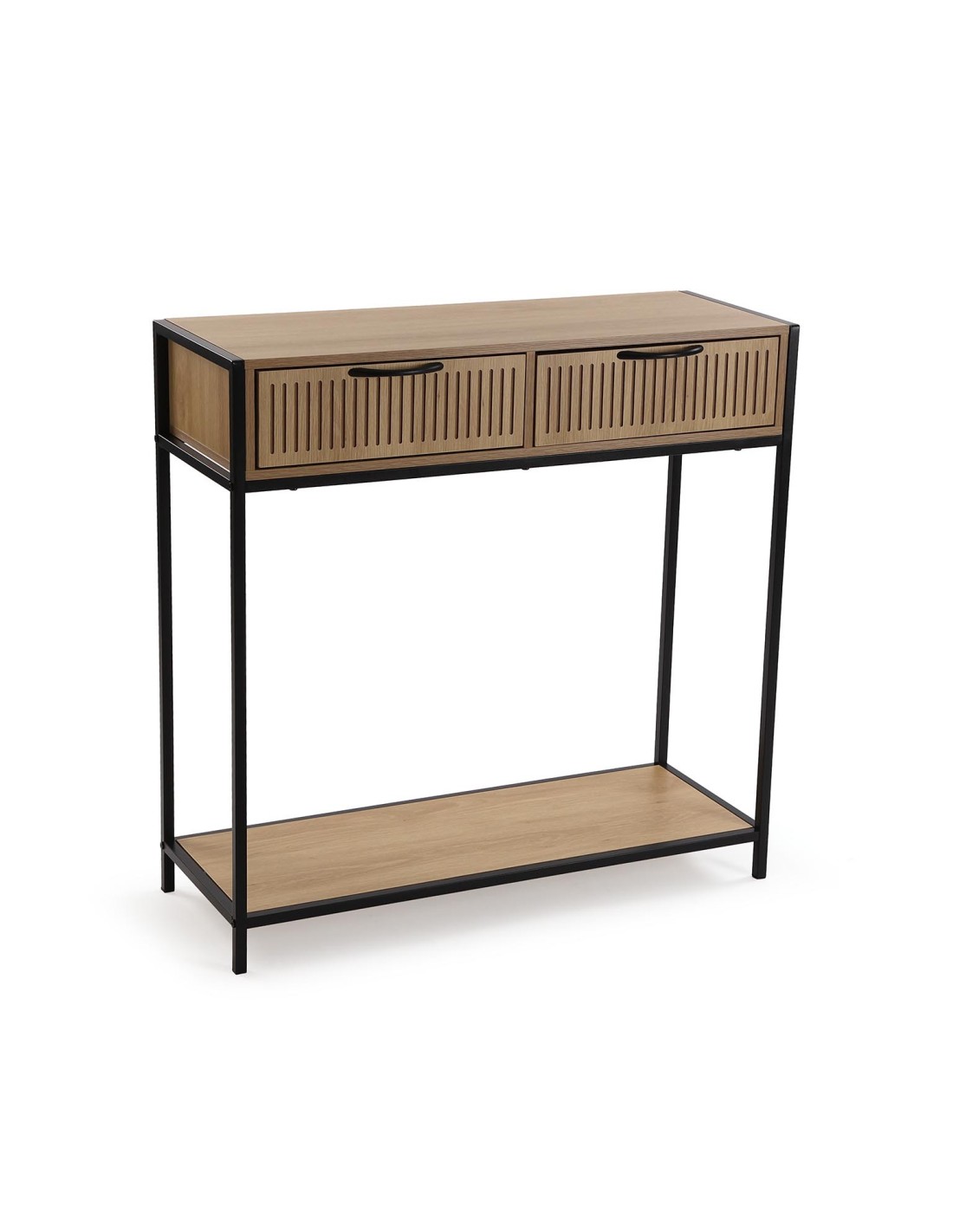 El Mueble de entrada Nasville 2 cajones es una consola diseñada para quienes buscan un recibidor práctico, elegante y con un marcado estilo contemporáneo. Fabricado en madera y metal negro, este mueble combina materiales resistentes con un diseño de líneas rectas que aporta orden visual y un aire moderno a cualquier espacio.
