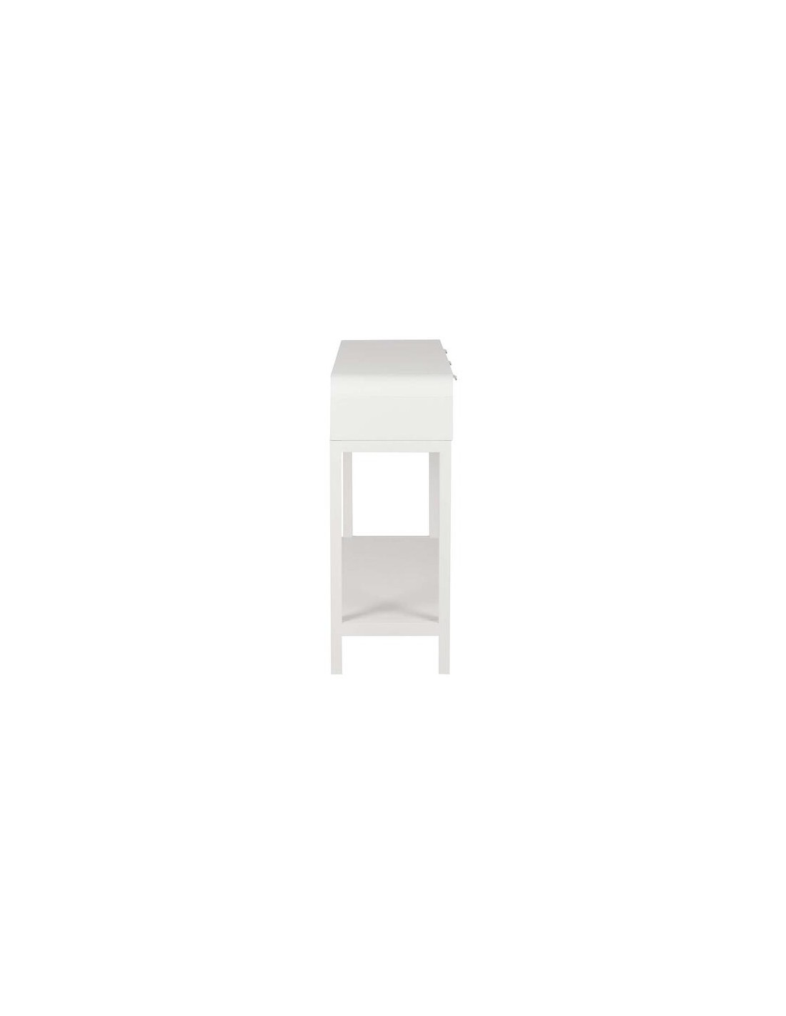 El mueble cuenta con una estructura rectangular con cuatro patas metálicas situadas en cada esquina que garantizan estabilidad y resistencia. Además, incorpora tres cajones del mismo color que permiten guardar cómodamente pequeños objetos del día a día como llaves, documentos o accesorios personales.