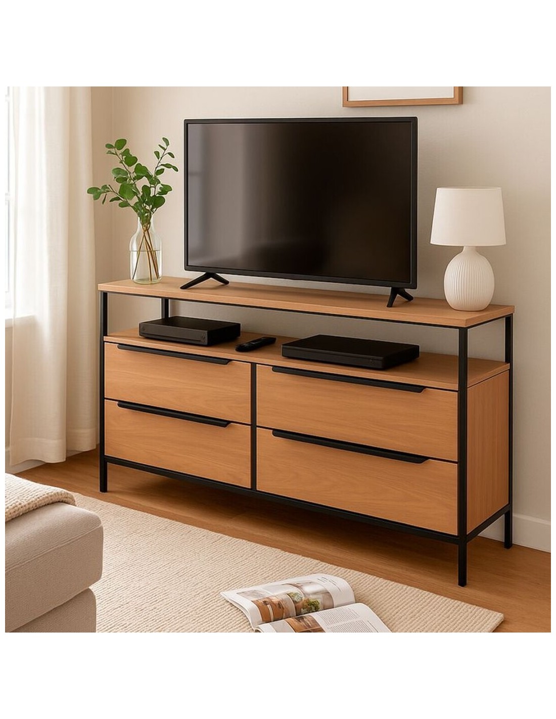 Funcional y moderno mueble de televisión fabricado en melamina en color roble con estructura de metal pintada en negro. Está compuesto por 4 cajones de tela con frontal a juego y un práctico estante para accesorios o dispositivos multimedia.