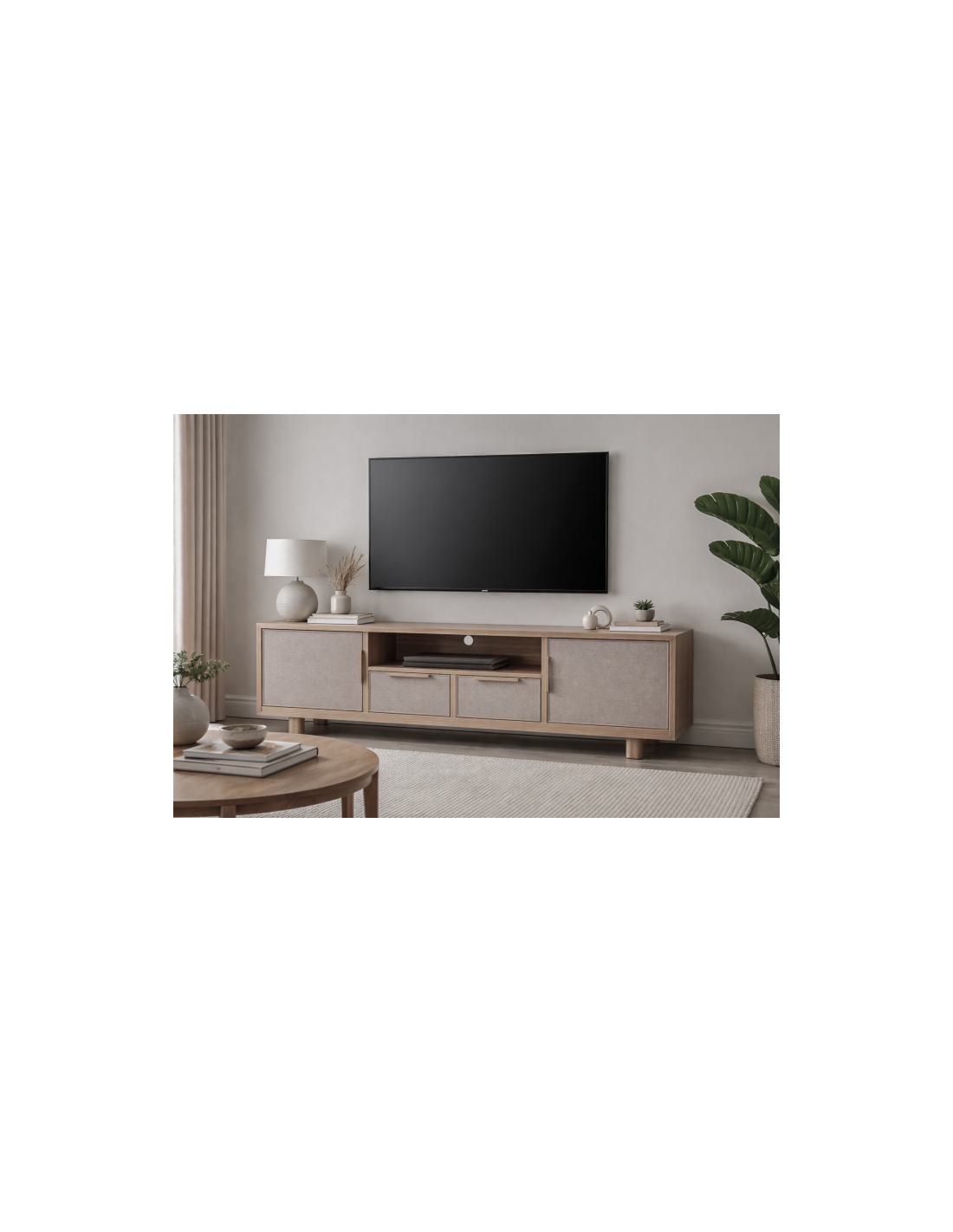 Con unas medidas de 183 cm de ancho y 55 cm de alto, ofrece un amplio espacio para televisores de gran formato, además de aportar una presencia destacada en el salón.