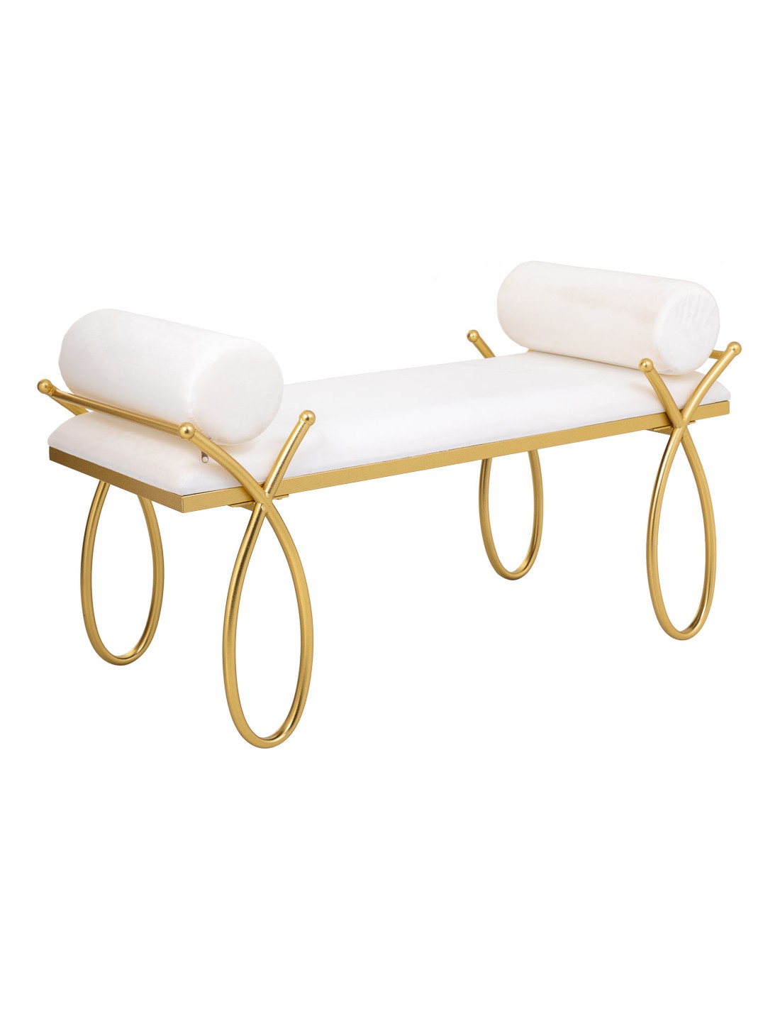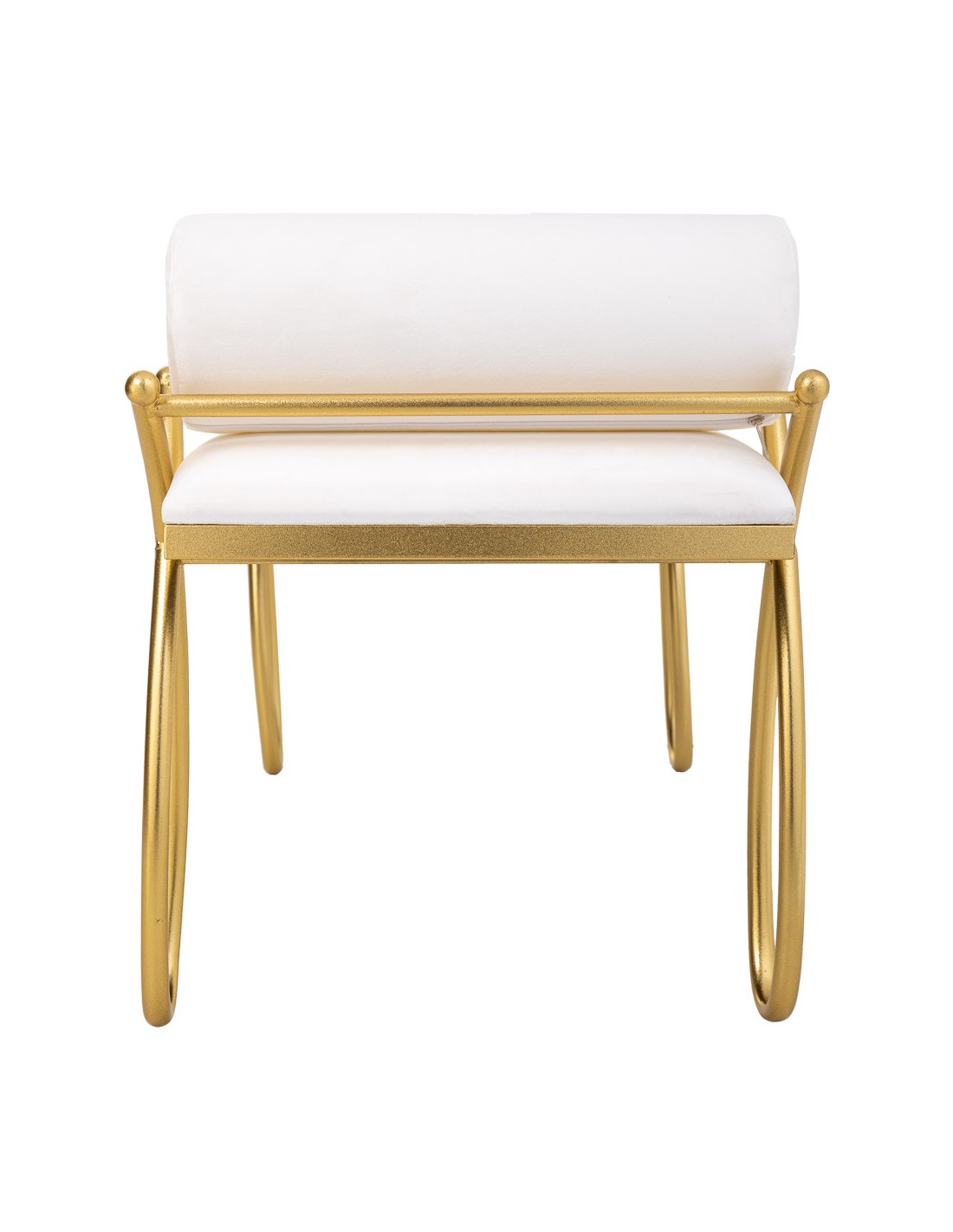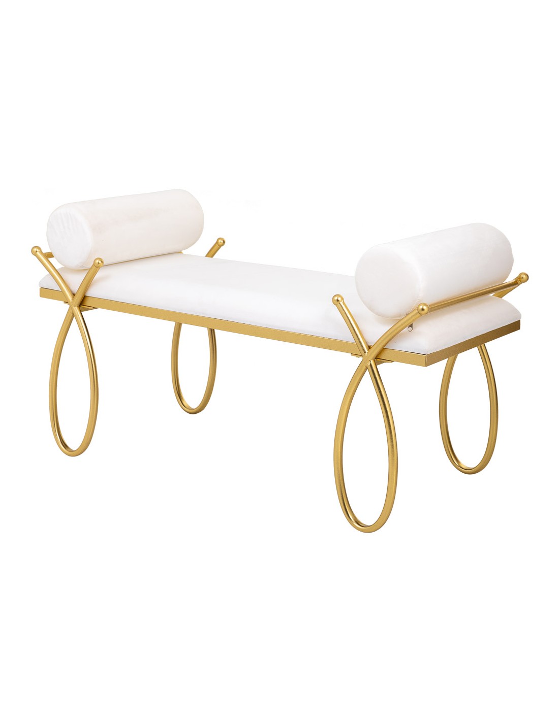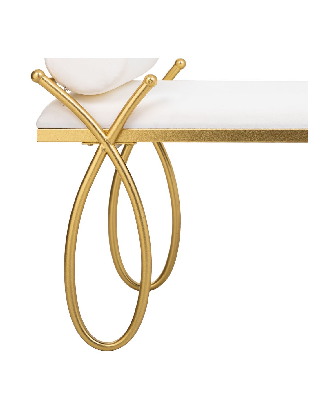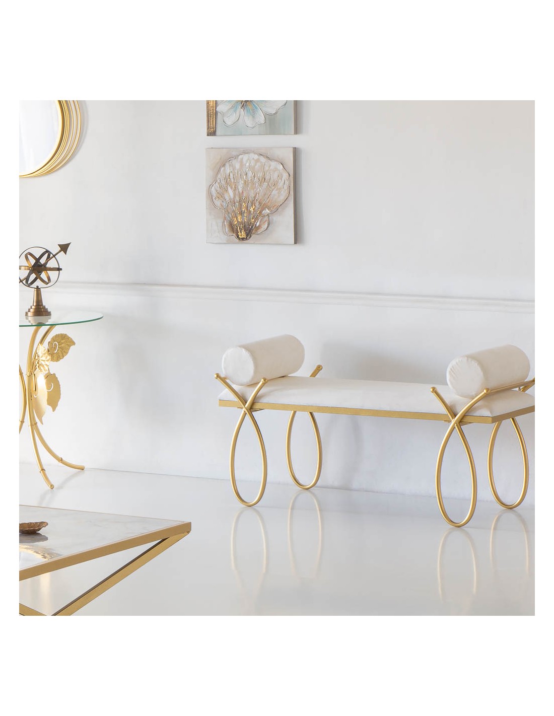 Esta banqueta descalzadora fabricada con estructura de metal pintada en color dorado y asiento tapizado en blanco es una pieza perfecta para aportar estilo, comodidad y funcionalidad a cualquier estancia del hogar. Su diseño elegante combina líneas modernas con un acabado sofisticado que destaca fácilmente en la decoración.