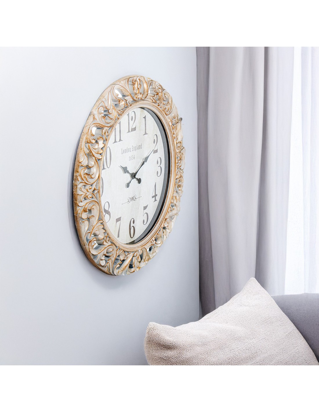 El reloj de pared en dorado envejecido ofrece múltiples beneficios tanto decorativos como funcionales. Su gran tamaño permite que destaque desde cualquier ángulo, convirtiéndose en un punto focal elegante y atractivo dentro de la estancia. Además, su acabado melaminado garantiza durabilidad, resistencia y un aspecto cuidado durante años.