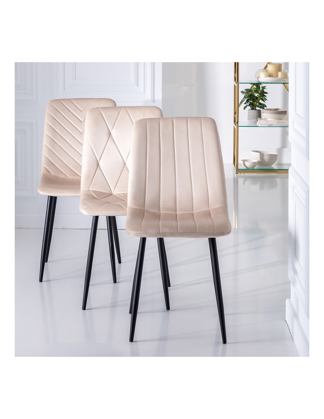 Gracias a su diseño equilibrado y a sus medidas proporcionadas, la Silla Beige Terciopelo Líneas se adapta fácilmente a diferentes estilos decorativos, desde ambientes modernos y minimalistas hasta espacios más cálidos y elegantes. Es una silla pensada para el uso diario, resistente y confortable, capaz de ofrecer una excelente experiencia tanto en comidas prolongadas como en reuniones o momentos de descanso.