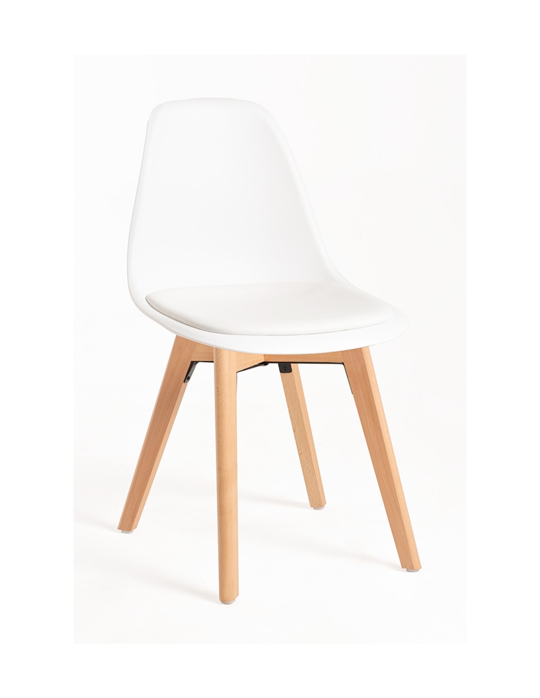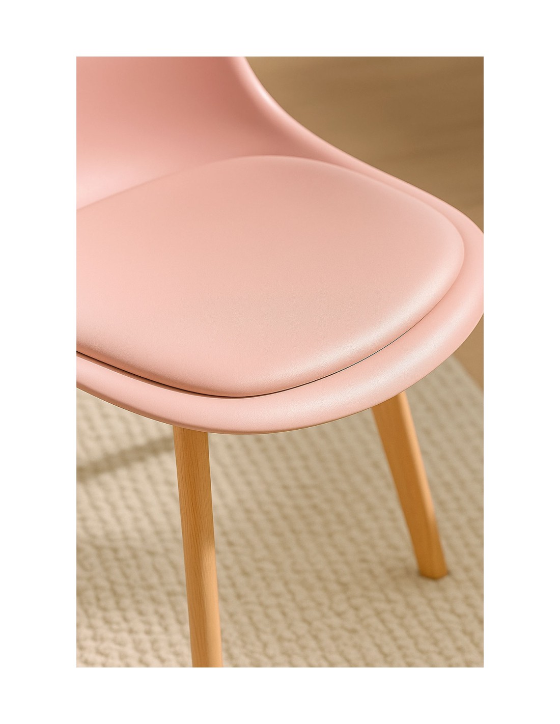 Silla fabricada en polipropileno con patas de madera de haya reforzadas y cojín relleno de polipiel