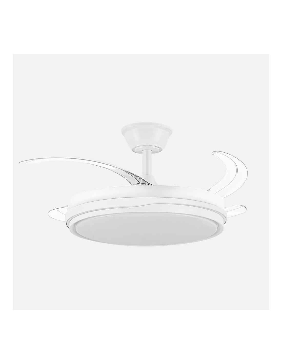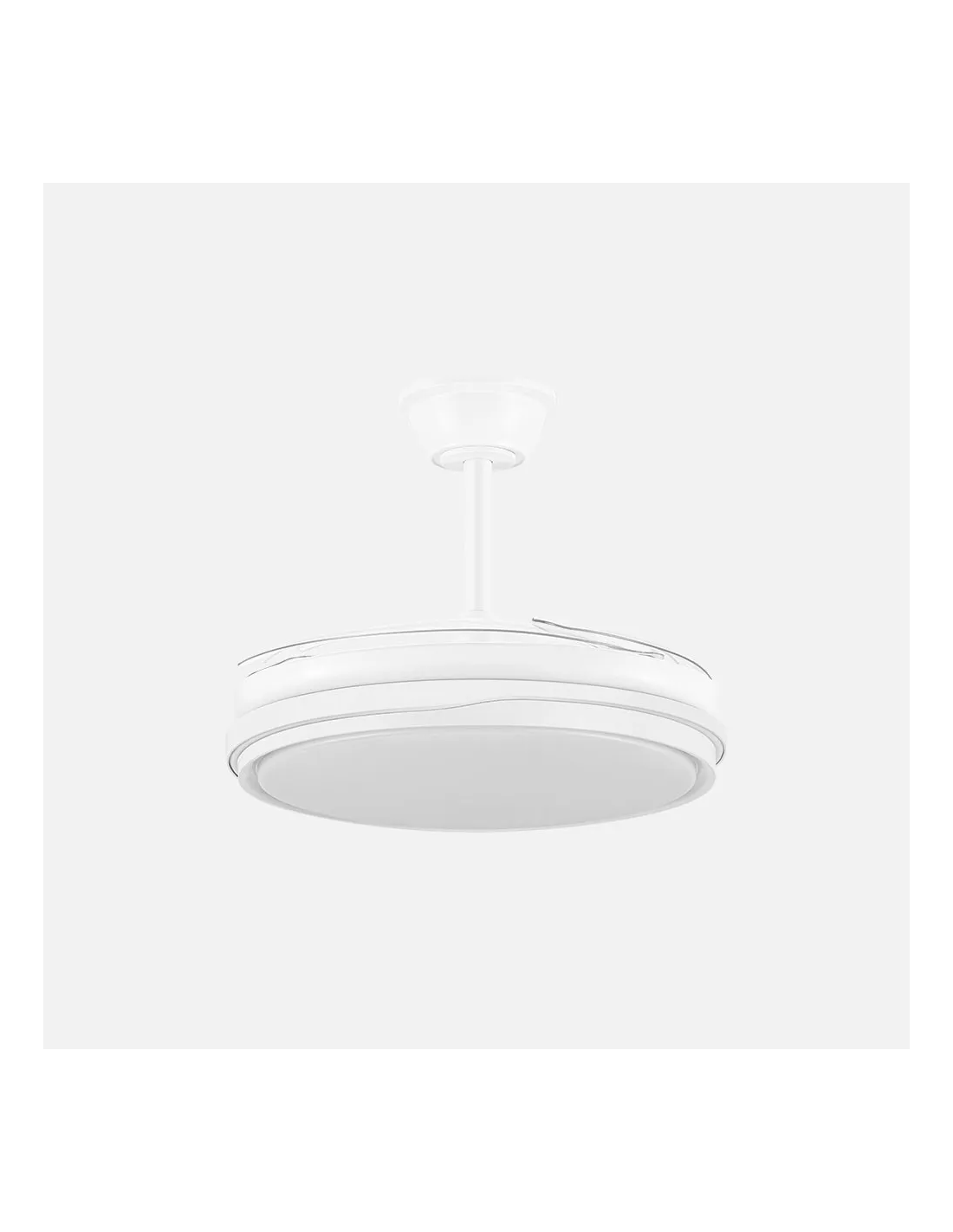 Este modelo destaca por su acabado en color blanco, ideal para aportar luminosidad y amplitud visual a cualquier estancia. Su diseño minimalista y sus aspas retráctiles permiten mantener una estética limpia cuando no está en funcionamiento.