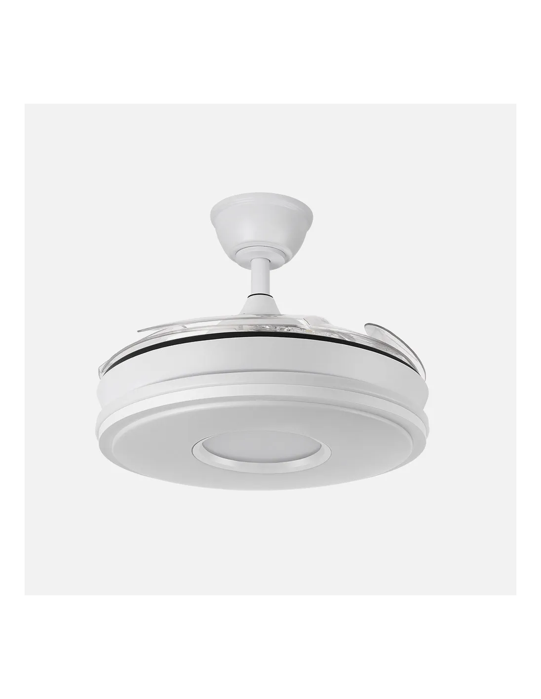 Su acabado en color blanco aporta luminosidad y sensación de amplitud, integrándose fácilmente en cualquier estilo decorativo. Gracias a sus aspas retráctiles, mantiene una estética limpia y discreta cuando no está en funcionamiento.